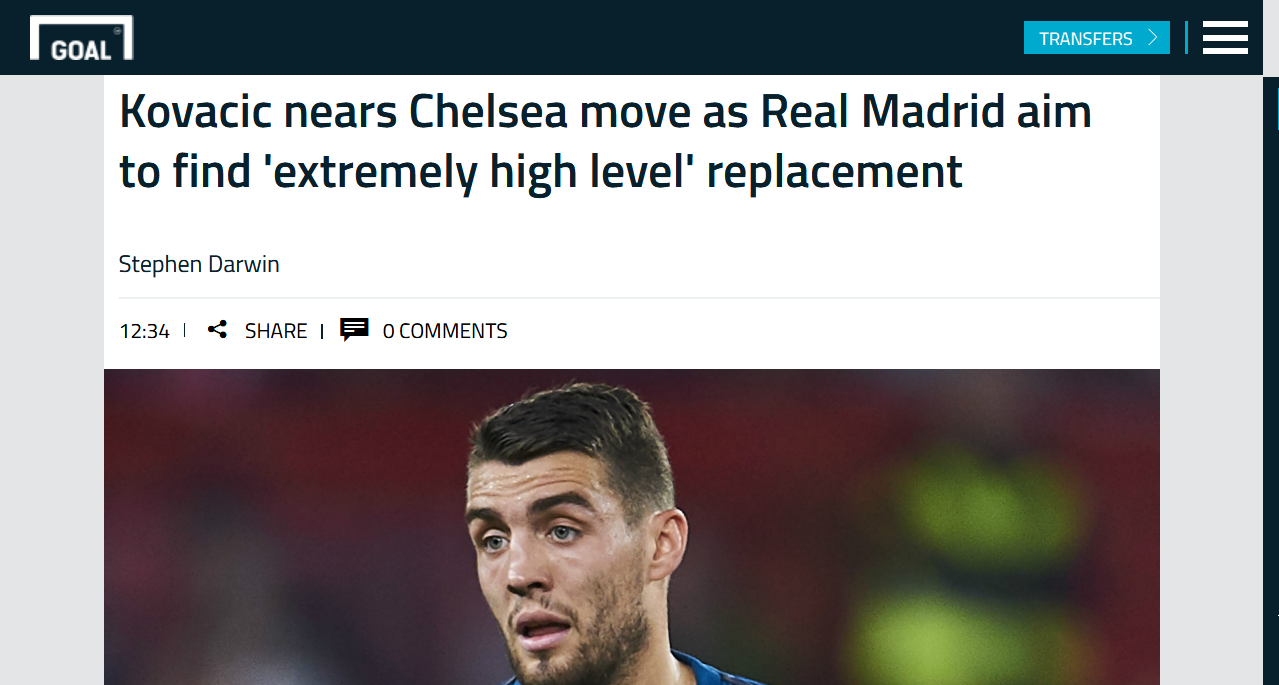 سایت گل دقایقی قبل خبرداد انتقال کواچیچ به چلسی قطعی است وتنها موضوعی که دوتیم برسرآن همچنان درحال مذاکره اند قطعی بودن یا قرضی بودن انتقال است .کواچیچ وچلسی هردو خواهان انتقال قطعی ودایمی ویا انتقال قرضی بابند دایمی هستند ولی رئال مادرید منتظروضعیت انتقال کورتوا است تاتصمیم نهایی رابگیرد. لوپتگی مربی رئال باتایید درخواست کواچیچ برای پیوستن به چلسی گفت:کواچیچ یک بازیکن فوق العاده است که هرمربی دوست دارد اورا درترکیبش داشته باشدمن تمام تلاشم رابرای متقاعدکردن او برای ماندن در رئال انجام دادم اما وی مصرانه خواهان پیوستن به چلسی است بنابراین باشگاه باید بدنبال جایگزین کردن بازیکنی دیگربجای اوباشد.