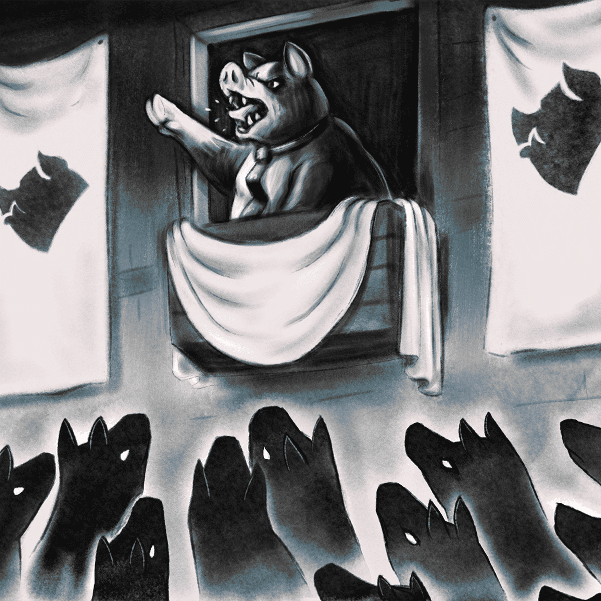 در ادامه، خوکی که رئیس شده تعدادی از حیوانات را به جرم همکاری با خوک فراری دادهشده اعدام میکنه و با سیاست و سؤ استفاده از سادگی بقیه، اونها را مجبور به کار کردن در ازای دریافت غذای بسیار کم میکنه.