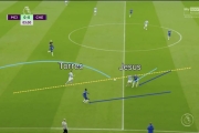 دیاز به جای ارسال پاس کوتاه، توپ بلندتری را به بال راست (در طول خط آبی آسمانی) میفرستد. ژسوس عقب کشیده تا توپ را دریافت کند و همین موضوع آندریاس کریستنسن را به دنبال او میکشاند، در حالی که تورس توپ را با خطوط نقطه چین زرد نشان داده شده از سمت چپ به راست دنبال میکند. رودیگر و کریستنسن هر دو حالا دور از پست خود هستند.