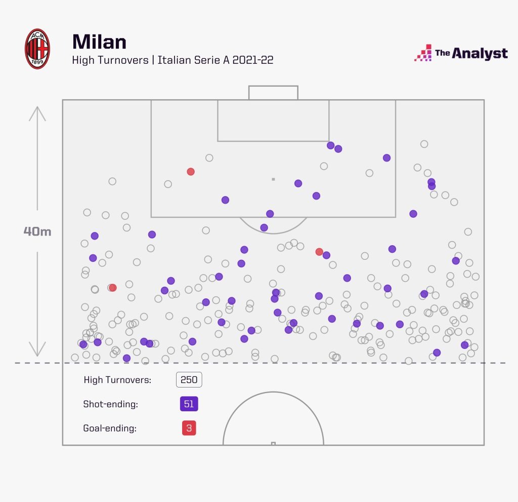 میلان 250 اقدام برای بازپسگیری توپ در 40 متر انتهایی زمین حریف داشته است؛ 51 اقدام تبدیل به شوت و سه تای آنها به گل منجر شده است