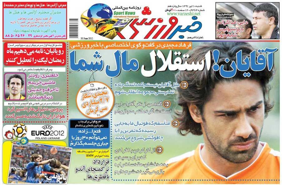 جلد روزنامه خبرورزشی شنبه ۱۰ تیر ۱۳۹۱ را میبینید!چیزی شبیه استقلال اینروزهای سردار آجرلو