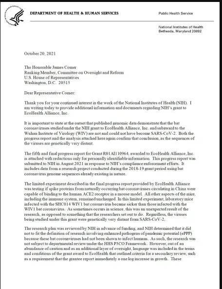 نامه لارنس تبک(معاون موسسه ملی سلامت) به کنگره در 20 اکتبر 2021