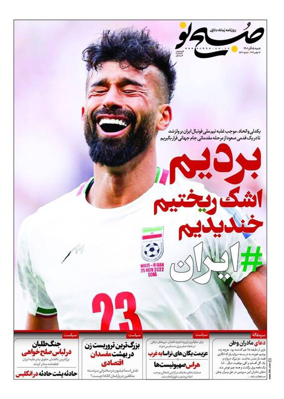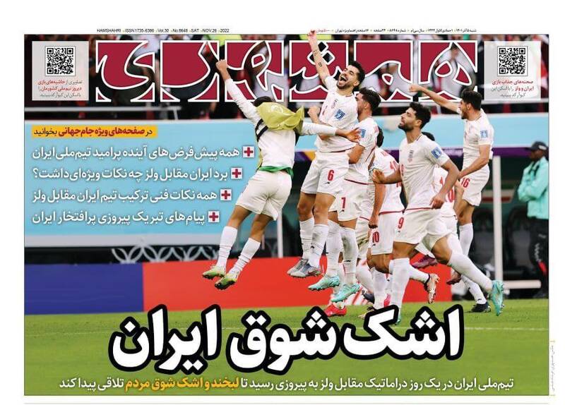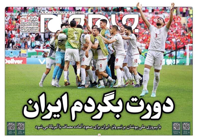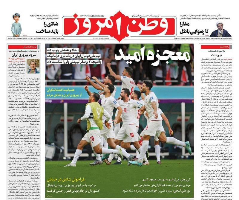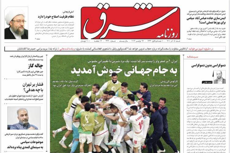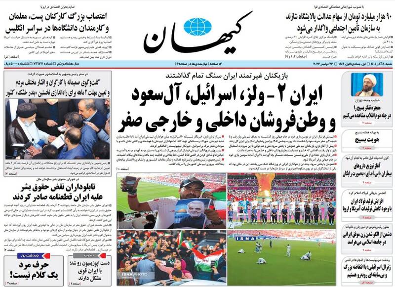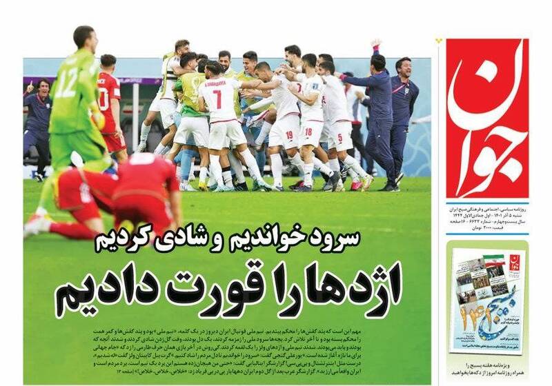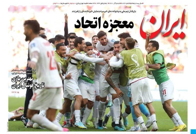ایران۲ ولز اسرائیل آل سعود وطن فروشان داخلی و خارجی صفر، معجزه اتحاد، اشک شوق ایران، دورت بگردم ایران، سرود خواندیم وشادی کردیم اژدها راقورت دادیدم از جمله تیترهای روزنامهها در روزشنبه ۵ آذر است.