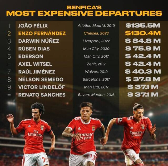 این بدان معناست که در شش سال گذشته، بنفیکا 74۰ میلیون پوند از فروش بازیکنان به دست آورده است.مبلغی واقعاً حیرت آور که پول نقد و این فروش ها شامل دهه گذشته نمی شود بلکه آمار شش سال گذشته بوده است و حتی از فروش بازیکنانی مانند داوید لوئیز، آنخل دی ماریا و رناتو سانچز و یان اوبلاک و گونزالو گدس و... نیز چشم پوشی شده است.