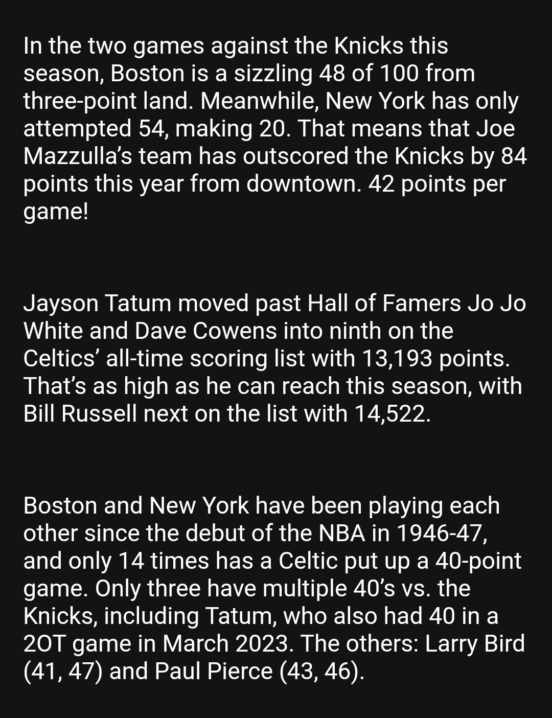 ثبت بیشترین 40 امتیاز 12 ریباند 8 اسیست در تاریخ سلتیکس 3 بار بیشتر از لری 2 بار 86 و 92 و جان هولیچکه 1 بار 68
