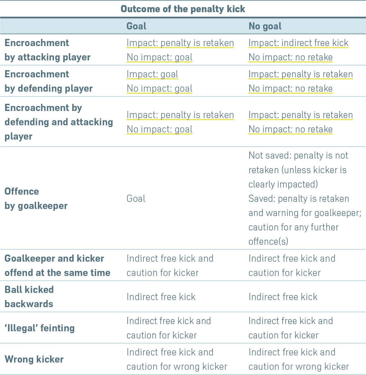 اگر بازیکنی در محوطه جریمه خود مرتکب خطایی علیه حریف شود که او را از یک فرصت آشکار گلزنی محروم کند و داور ضربه پنالتی اعلام کند، در صورتی که خطا تلاشی برای بازی با توپ یا یک تکل برای تصاحب توپ باشد، بازیکن خاطی با کارت زرد جریمه میشود. اما در سایر موارد (مانند نگه داشتن، کشیدن، هل دادن، یا زمانی که امکان بازی با توپ وجود ندارد)، بازیکن خاطی باید از بازی اخراج شود.