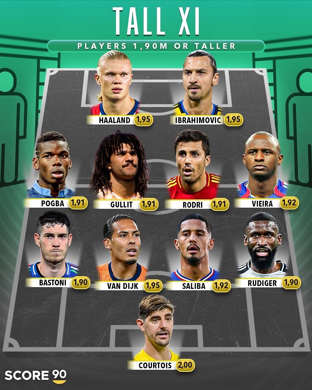 ترکیب بسیار جذابی است این ترکیب بر اساس بازیکنان 190 سانت تا به بالا حساب شده است و بازیکنان تشکیل دهنده این ترکیب عبارت اند از هالند ابراهیموویچ پوگبا جولیت رودری ویرا باستانی فن دایک سالیبان رودیگر و کورتوآ میباشند