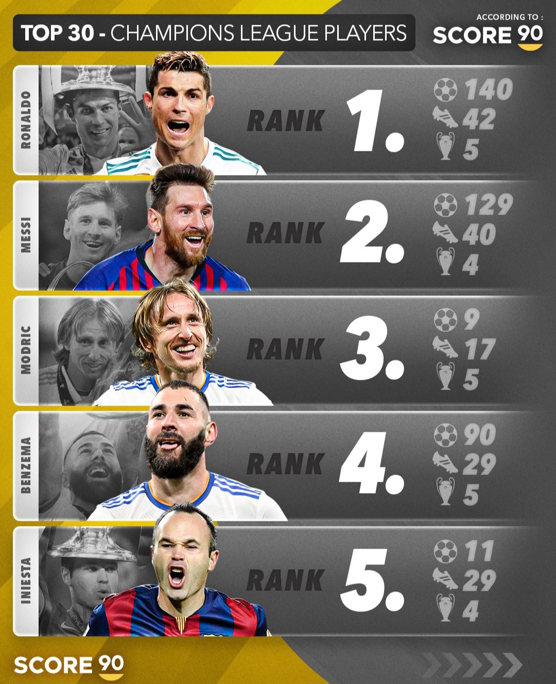 جادوگر آرژانتینی که با چهار قهرمانی در لیگ قهرمانان، نماد دوران طلایی بارسلونا شد. ۱۲9 گل در این رقابتها ثبت کرد و بارها بهترین بازیکن فصل شد. در فینالهای ۲۰۰۹ و ۲۰۱۱ گل زد و بازی را به نفع تیمش درآورد. ترکیب خلاقیت، تکنیک و آرامش او، برای سالها کابوس مدافعان اروپا بود. هر بار که پا به زمین میگذاشت، نوید یک نمایش تکرارناشدنی را میداد.