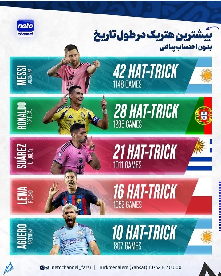 لیونل مسی، فوقستاره آرژانتینی، با ثبت ۴۲ هتتریک بدون پنالتی در ۱۱۴۸ بازی، در صدر این فهرست قرار دارد. نکته قابلتوجه اینکه تمامی این گلها در جریان بازی و بدون کمک از ضربات پنالتی به ثمر رسیدهاند. این آمار، مسی را به عنوان یکی از کارآمدترین و خلاقترین گلزنان تاریخ فوتبال معرفی میکند.