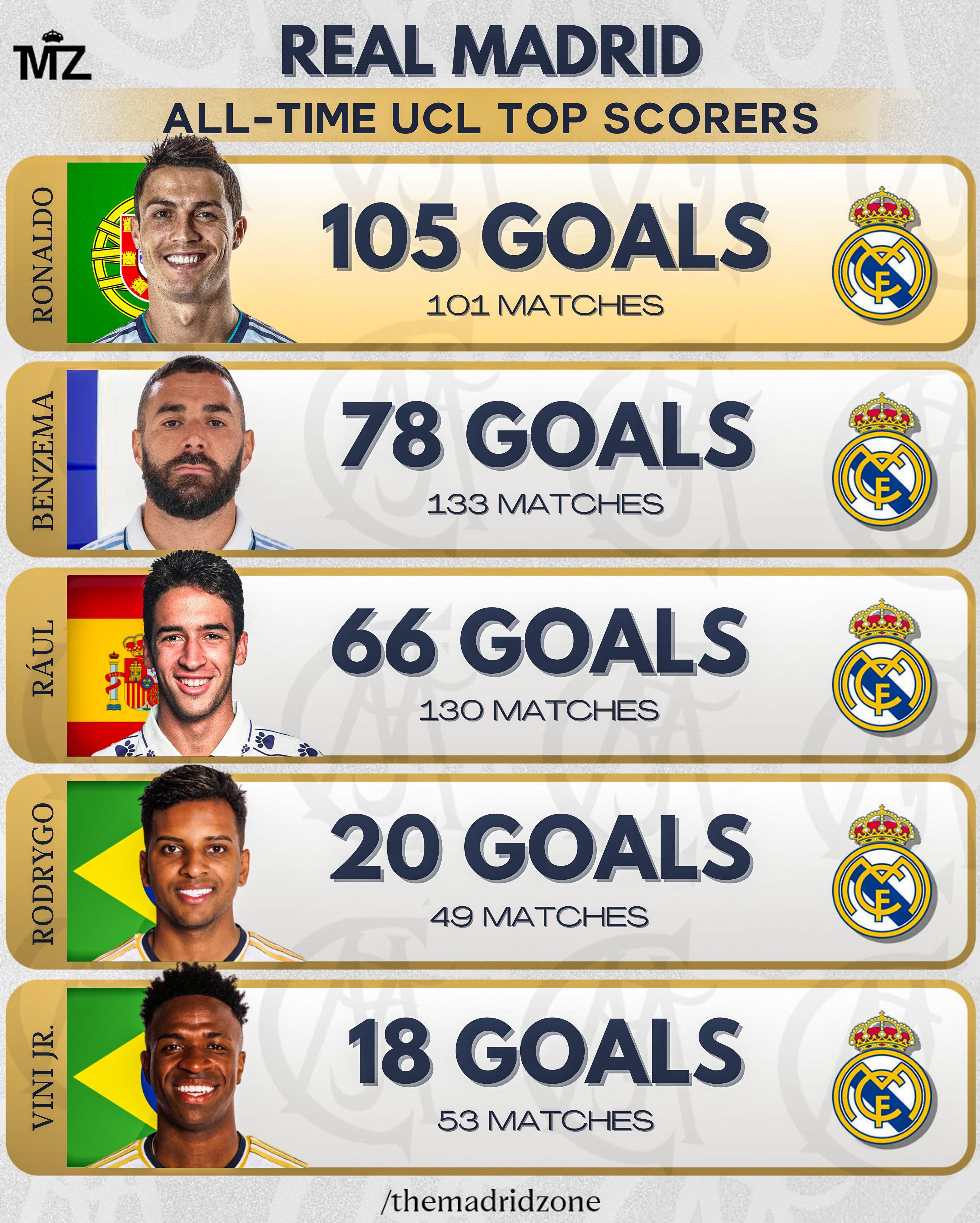 با ۱۰۵ گل در تنها ۱۰۱ بازی برای رئال مادرید، نهتنها رکورددار تاریخ باشگاه در این رقابتهاست، بلکه میانگین بالای یک گل در هر بازی، نشاندهندهی هیولایی تمامنشدنی در شبهای اروپاست.