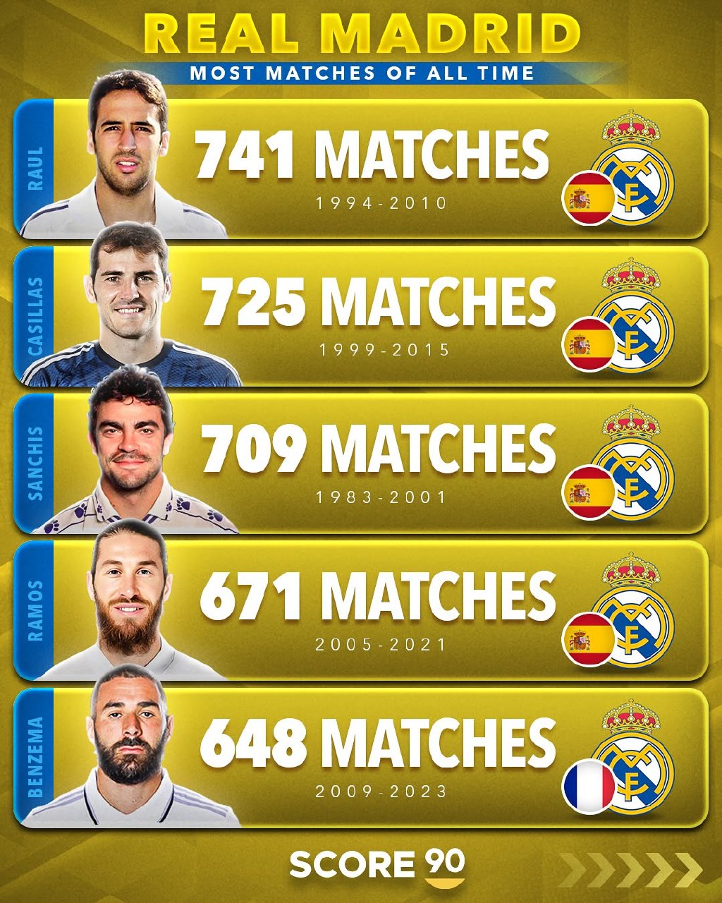 ۵ بازیکن با بیشترین بازی برای رئال مادرید در تاریخ