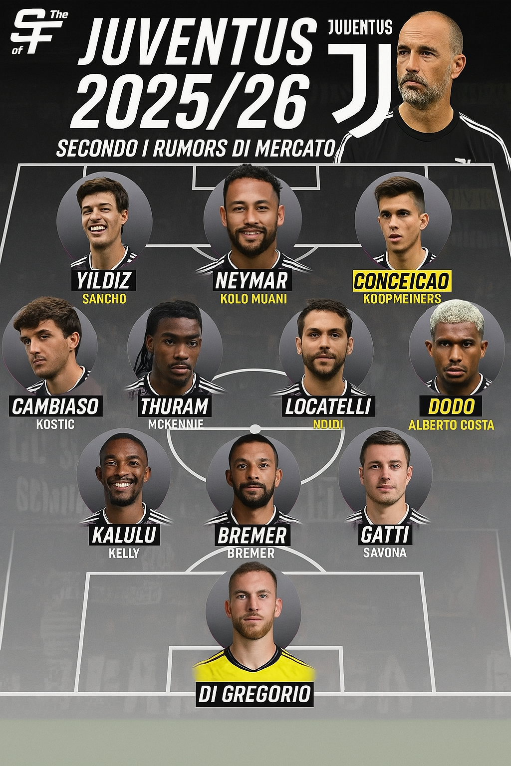 در این تصویر شاهد ترکیب احتمالی تیم فوتبال یوونتوس برای فصل ۲۰۲۵/۲۶ بر اساس شایعات نقل و انتقالات هستیم. این ترکیب که توسط رسانههای ایتالیایی و منابع نزدیک به باشگاه یوونتوس طراحی شده، نمایانگر برنامههای بلندپروازانه باشگاه تورینی برای بازسازی و رقابت در سطح اول فوتبال اروپا است. حضور ستارگان سرشناس مانند نیمار و بازیکنان جوان آیندهدار، ترکیبی هیجانانگیز و قدرتمند را به تصویر کشیده است.