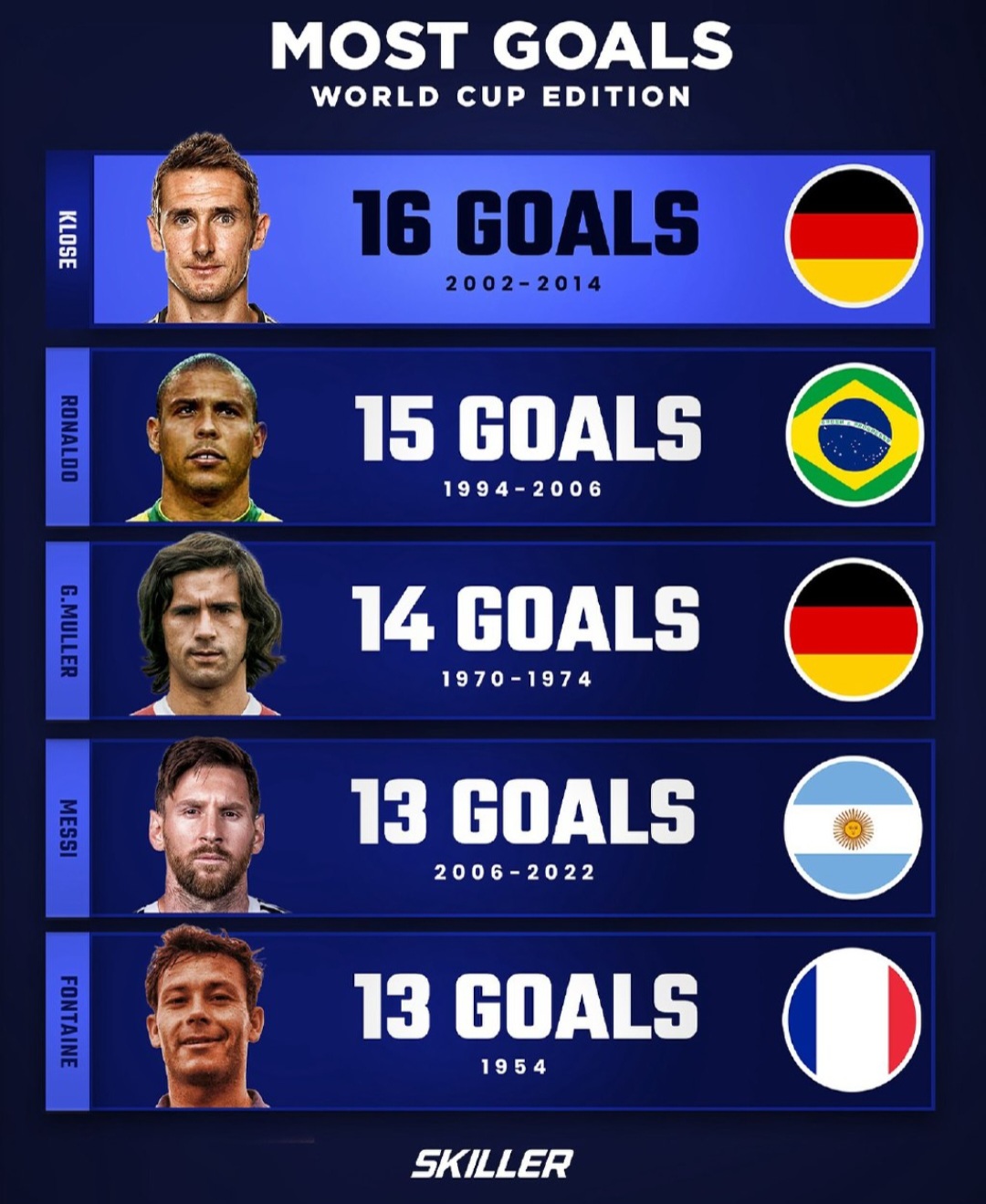 Most Goals – World Cup Edition فقط یک لیست نیست؛ نمایشیست از بازیکنانی که در لحظات حیاتی، تفاوت را رقم زدند. کلوزه، رونالدو، مولر، فونتین و مسی هرکدام به سبک خودشان، تاریخ جام جهانی را بازنویسی کردند.