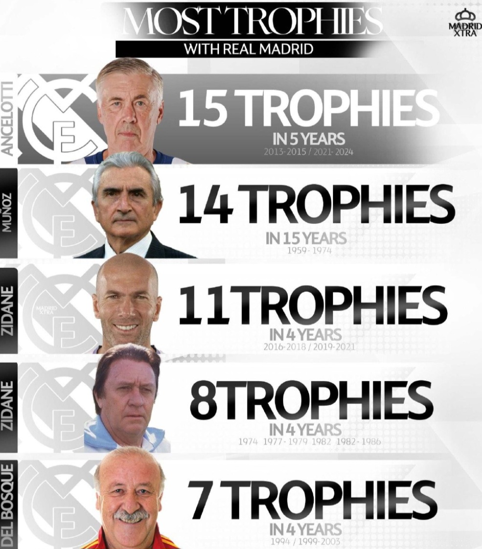 هر یک از این مربیان با سبکهای مختلف و در شرایط متفاوت به موفقیتهای چشمگیری دست یافتهاند. کارلو آنچلوتی بهعنوان یک استراتژیست بزرگ، میگل مونیوز بهعنوان بنیانگذار شکوفایی تیم، زینالدین زیدان بهعنوان یک مدیر حرفهای، لوئیس مولونی بهعنوان یک مربی با نبوغ تاکتیکی و ویسنته دلبوسکه بهعنوان یک مدیر باهوش و متوازن، هر کدام به نوعی در تاریخ رئال مادرید نقشآفرینی کردهاند.