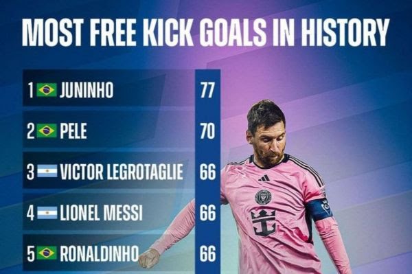 *در بازی اینتر میامی مقابل کلمبوس کرو لیونل مسی یک گل دیدنی از روی ضربه ایستگاهی به ثمر رساند و این گل موجب شد تا جایگاه مسی در میان بازیکنانی که در تاریخ فوتبال بیشترین گل را از روی ضربه ایستگاهی به ثمر رسانده اند، بالاتر بیاید.
