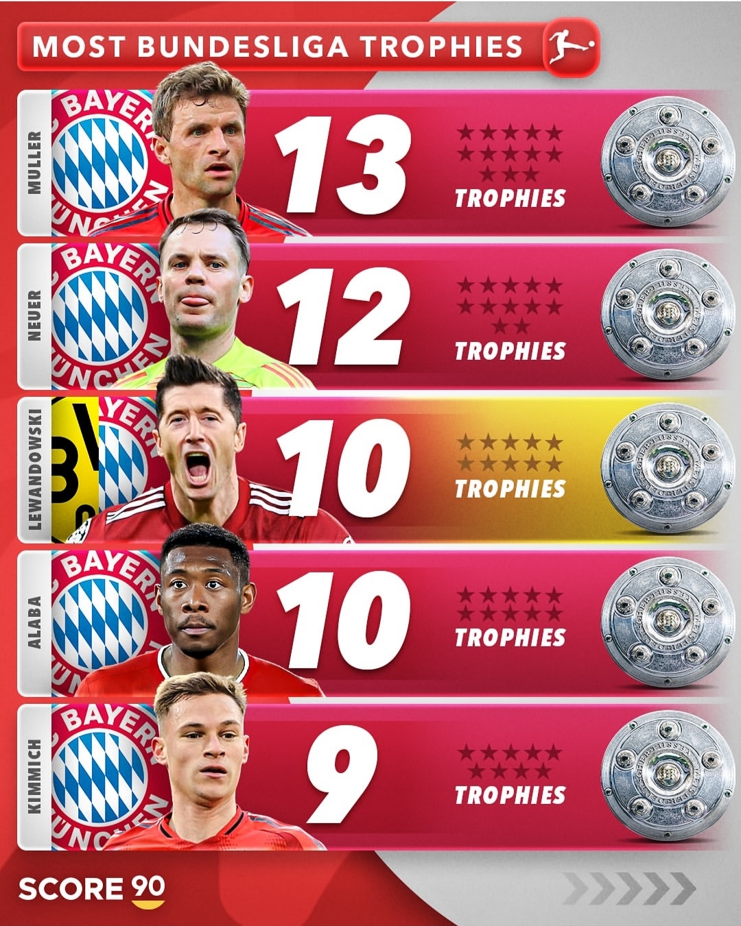 لواندوفسکی تاکنون موفق به کسب **۱۰ قهرمانی در بوندسلیگا** شده است که نشاندهنده تأثیر مستقیم او در موفقیتهای تیمهایش است. این قهرمانیها، نتیجه ترکیبی از قدرت بدنی، هوش تاکتیکی و مهارت گلزنی بینظیر لواندوفسکی است که باعث شده همواره جزو برترین مهاجمان لیگ باقی بماند.
