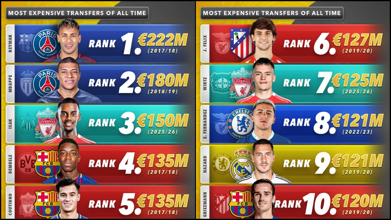 کیلیان امباپه با 180 میلیون یورو از موناکو به پاریس در سال 2018 دومین انتقال بزرگ فوتبال بوده و الکساندر ایساک با 150 میلیون یورو از نیوکاسل به لیورپول در همین تابستان 2025 سومین انتقال بزرگ تاریخ را ثبت کرد