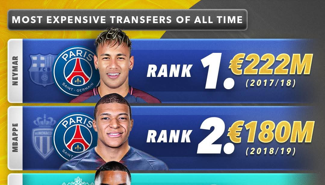🥇 نیمار – €222M به پاریسنژرمن (۲۰۱۷/۱۸)