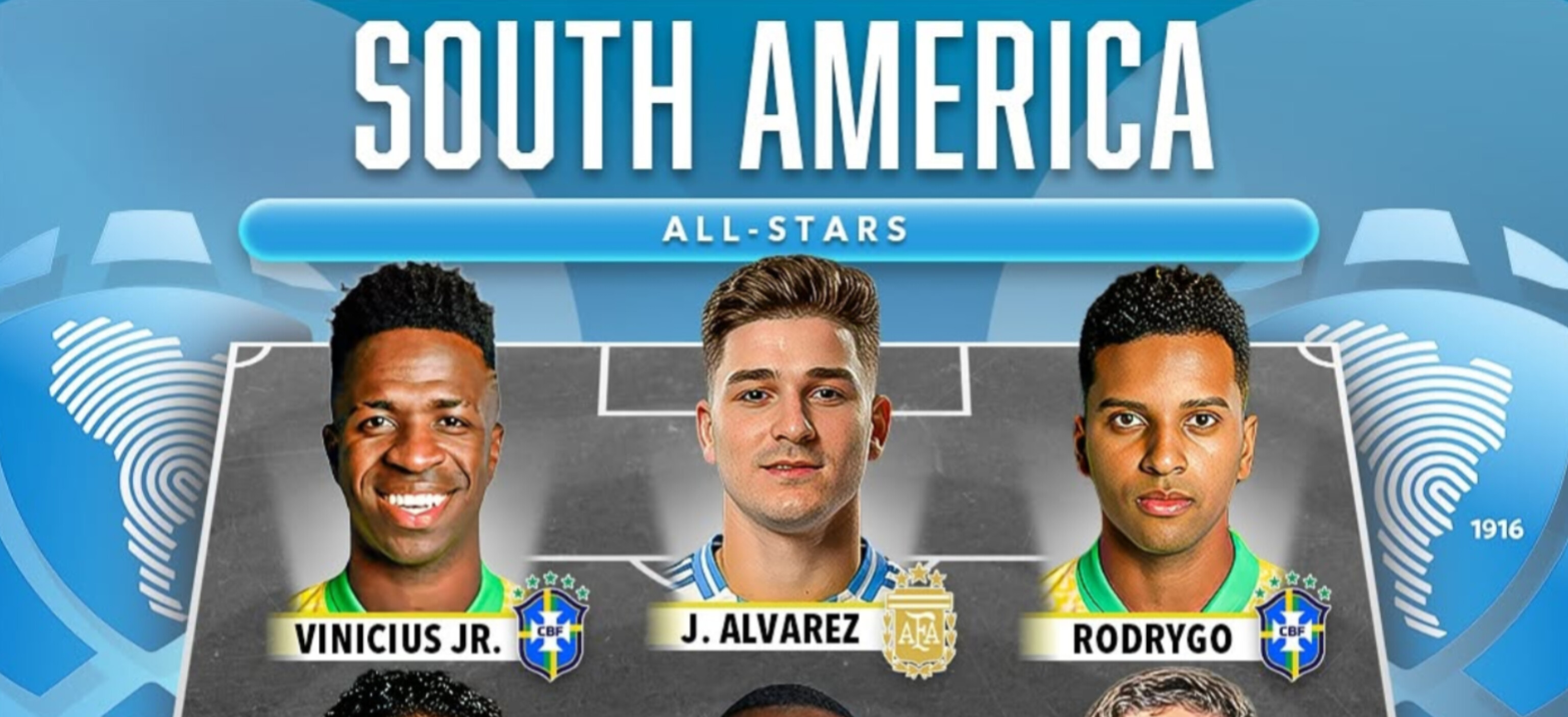 در تیم منتخب آمریکای جنوبی، بازیکنانی از کشورهای برزیل، آرژانتین، اروگوئه، اکوادور و کلمبیا حضور دارند. در خط حمله نامهای بزرگی چون وینیسیوس جونیور (Vinicius Jr)، خولیان آلوارز (J. Alvarez) و رودریگو (Rodrygo) به چشم میخورند که هر کدام در تیمهای باشگاهی خود مثل رئال مادرید و منچسترسیتی نقش کلیدی ایفا میکنند. در خط میانی هم رافینیا، کایسدو و والورده حضور دارند که ترکیبی از خلاقیت، قدرت بدنی و دوندگی بالا را ارائه میدهند. خط دفاعی این تیم شامل هینکاپیه، گابریل، مارکینیوش و دنیل مونیوز است که تجربه و قدرت دفاعی بالایی دارند. درون دروازه هم آلیسون بکر، دروازهبان تیم ملی برزیل و لیورپول ایستاده است که جزو بهترین گلرهای دنیا محسوب میشود.
