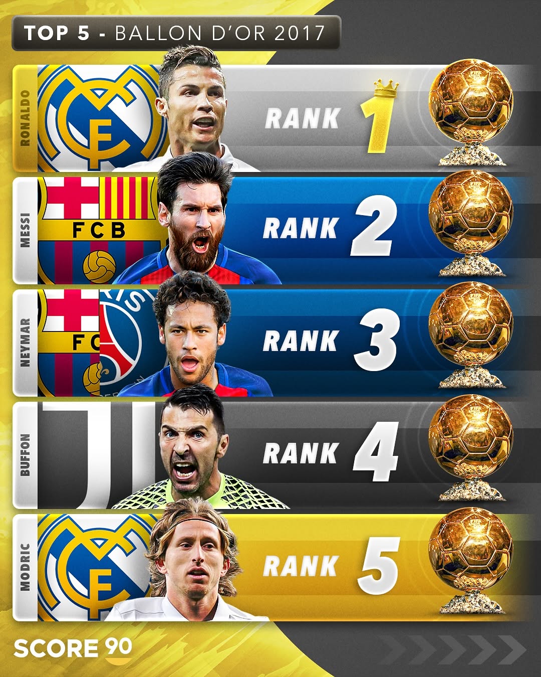 اگر به دنبال اطلاعاتی درباره توپ طلا و برندگان آن هستید، این فهرست به شما نشان میدهد که در سال ۲۰۱۷ چه کسانی در اوج قرار داشتند. کریستیانو رونالدو با کسب رتبه اول، مسی در جایگاه دوم، نیمار سوم، بوفون چهارم و مودریچ پنجم، پنج ستارهای بودند که دنیا در آن سال تحسینشان کرد. این تصویر، برای طرفداران فوتبال یادآور رقابتی تاریخی و جذاب بین بزرگترین بازیکنان عصر مدرن است.