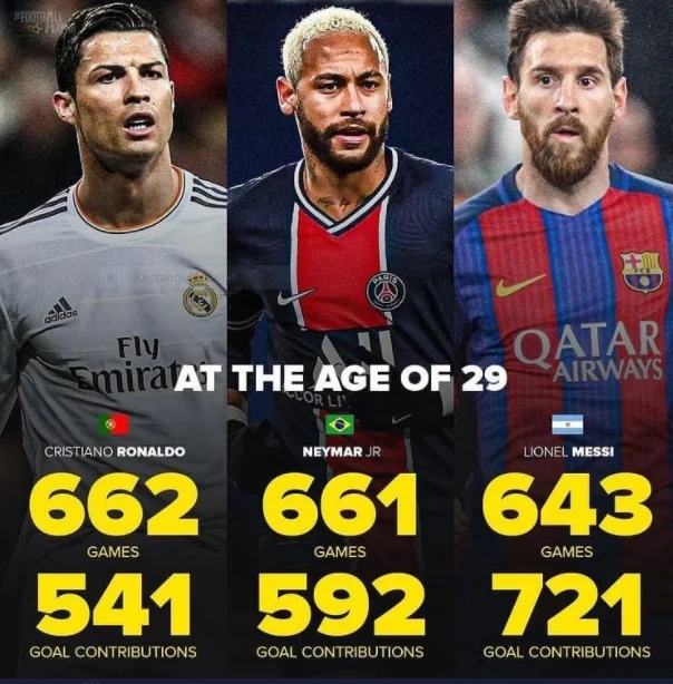 وقتی صحبت از بهترین بازیکنان تاریخ فوتبال میشود، همیشه نامهایی مثل رونالدو، نیمار و مسی مطرح میشوند. در تصویر بالا، آمار آنها در سن ۲۹ سالگی بررسی شده است؛ سنی که بسیاری آن را دوران اوج یک فوتبالیست حرفهای میدانند.