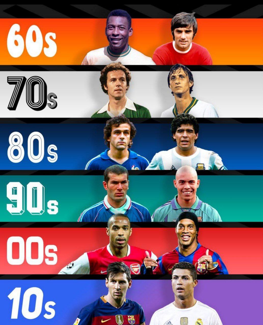 2 ستاره برتر تاریخ فوتبال در هر دهه از 1960 تا 2010؛ از پله و مارادونا تا کریستیانو رونالدو و لیونل مسی/ برترینهای تاریخ فوتبال