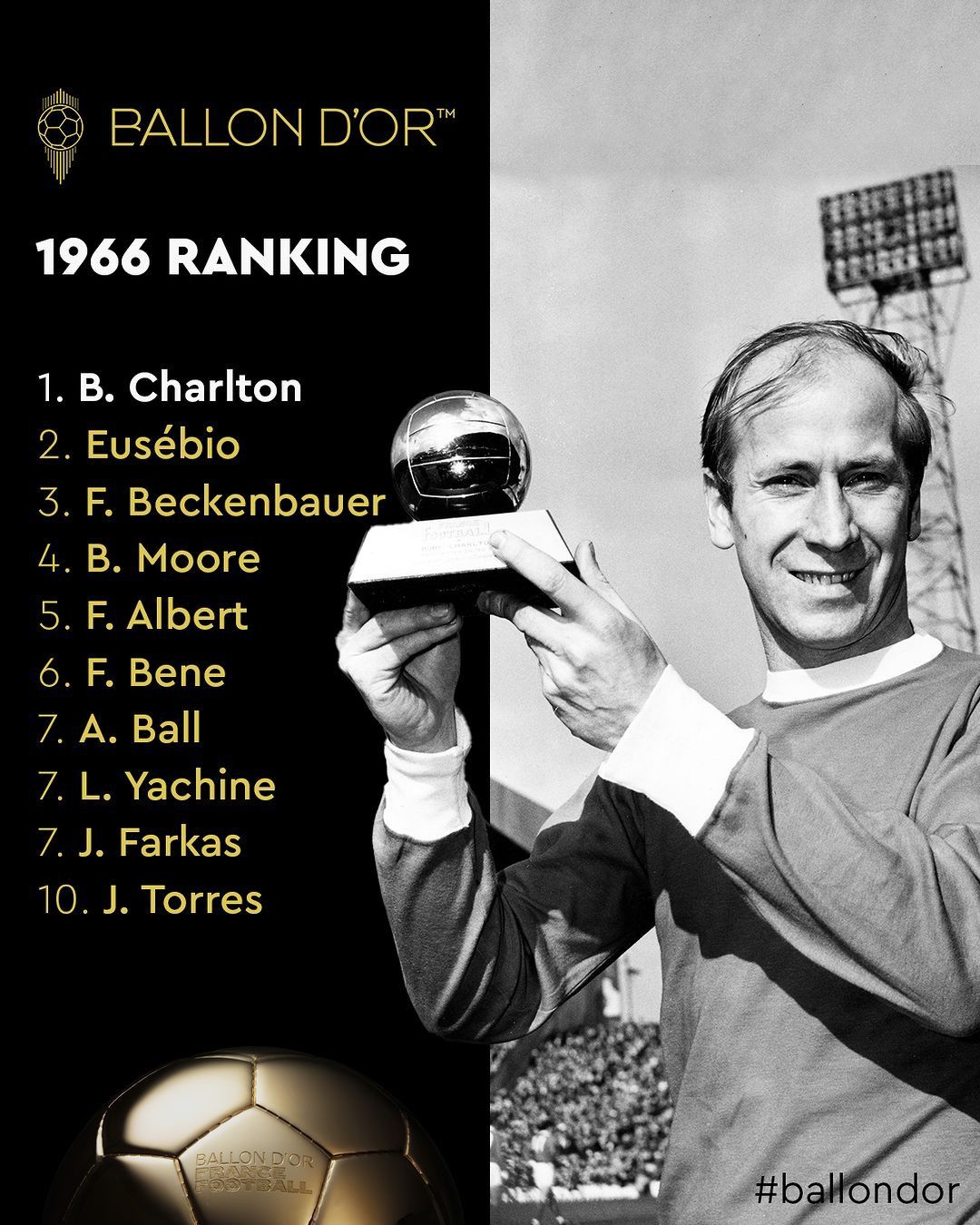 ترکیب منتخب و رویایی سال ۱۹۶۶ فوتبال جهان از لیست ۱۰ بازیکن برتر توپ طلا؛ با حضور بابی چارلتون، اوزهبیو و یاشینِ افسانهای/ یک مهاجم سرشناس در قلب خط دفاعی و مدافع پرتغالی هم در حمله هم در دفاع!