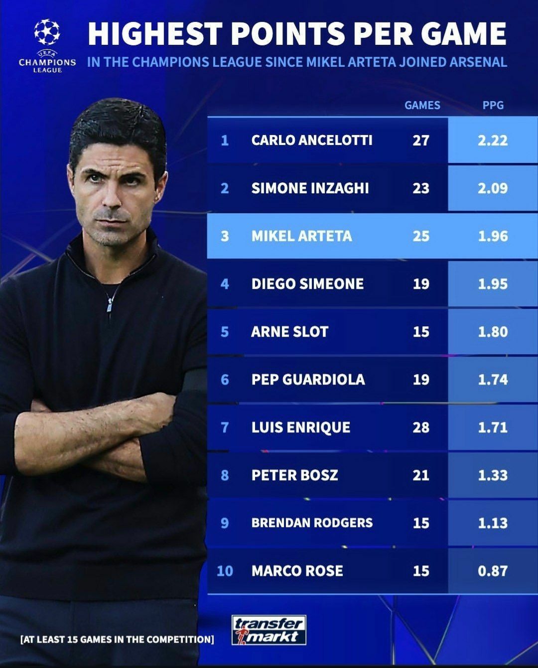 میکل آرتتا: آرتتا با میانگین ۱/۹۶ امتیاز پس از ۲۵ بازی روی نیمکت آرسنال، در رده سوم قرار دارد. آرتتا در این مدت ۱۵ پیروزی کسب کرده؛ در حالی که ونگر پس از ۲۵ مسابقه روی نیمکت توپچیها، با ۱۱ برد میانگین امتیازی ۱/۶ را ثبت کرده بود.