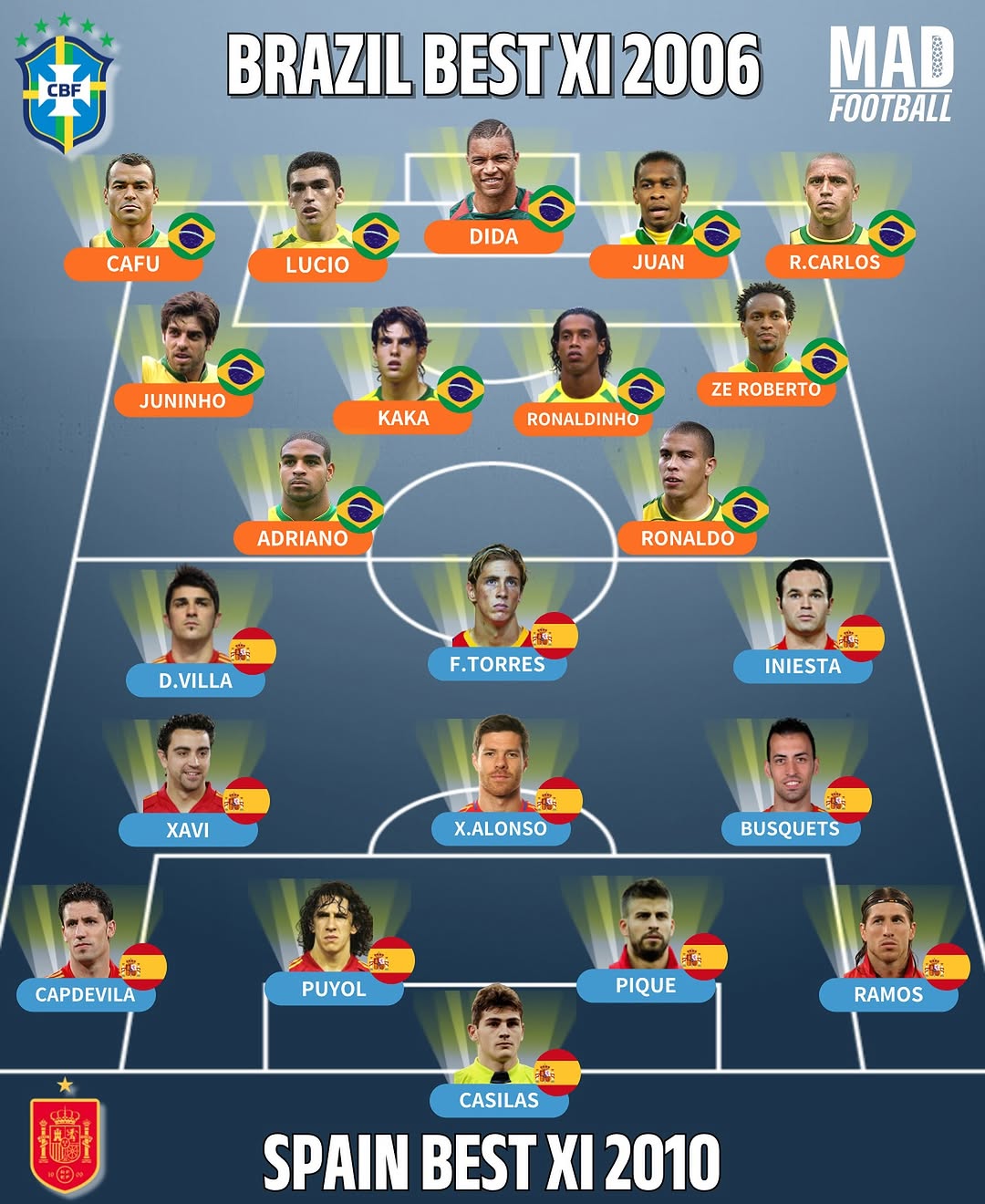 تیمهای ملی فوتبال برزیل و اسپانیا همیشه جزو پرقدرتترین و پرهوادارترین تیمهای تاریخ فوتبال بودهاند. در این تصویر ترکیب منتخب برزیل در سال 2006 و اسپانیا در سال 2010 به نمایش گذاشته شده است. دو تیمی که هر کدام در دورهای خاص نماد فوتبال زیبا، تکنیکی و تهاجمی بودند و بازیکنانی افسانهای را در ترکیب خود داشتند. مقایسه این دو ترکیب، هم برای علاقهمندان فوتبال جذاب است و هم نشاندهنده کیفیت فوقالعاده بازیکنان این نسلها محسوب میشود.