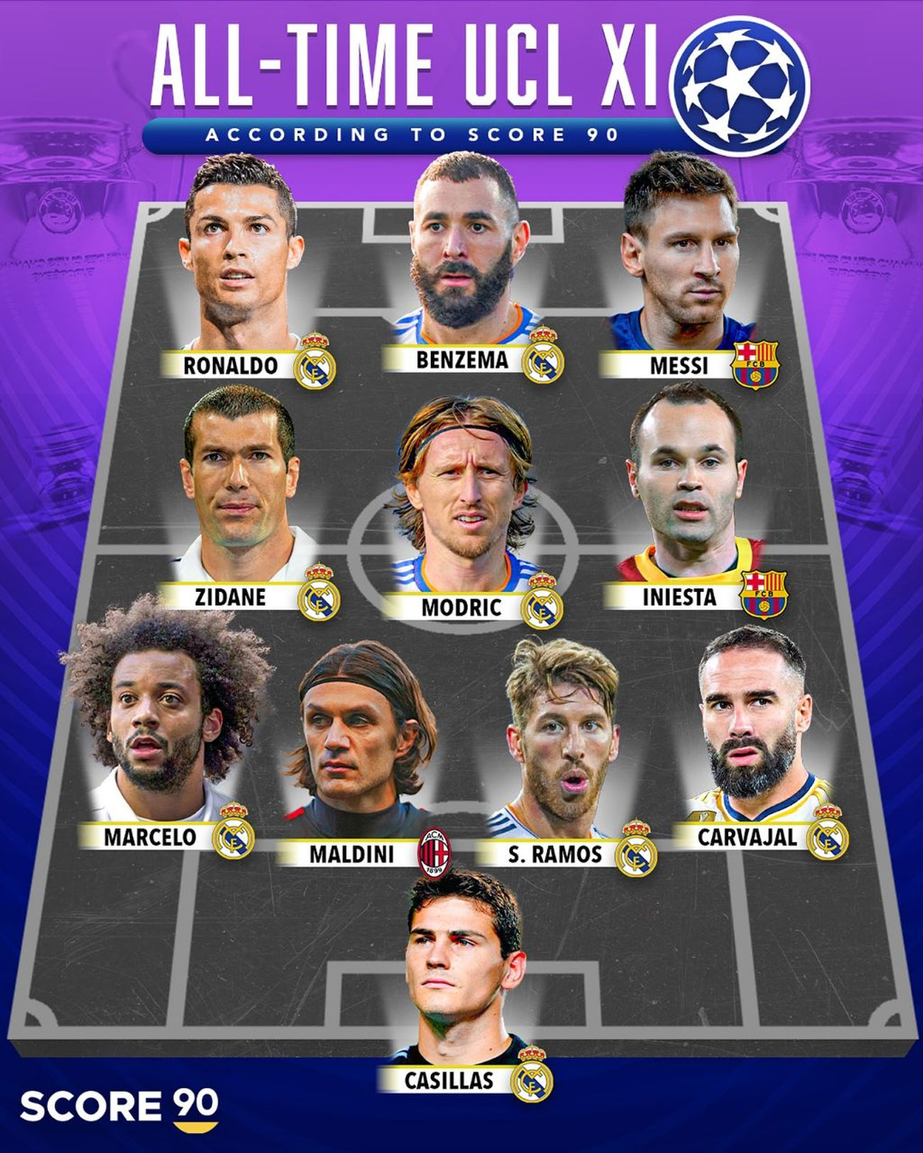 ترکیب منتخب تاریخ لیگ قهرمانان اروپا تعادل بیشتری داره: دفاع مستحکم (مالدینی–راموس–کارواخال–مارسلو)، هافبک کامل (مودریچ–اینیستا–زیدان) و خط حمله مرگبار (کریس–بنزما–مسی).