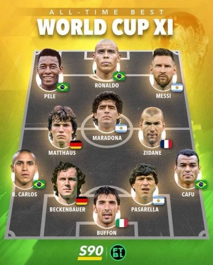 ترکیب منتخب تاریخ جام جهانی پله، رونالدو، مسی + مارادونا و زیدان پشت سرشون = کابوس هر دفاعی.