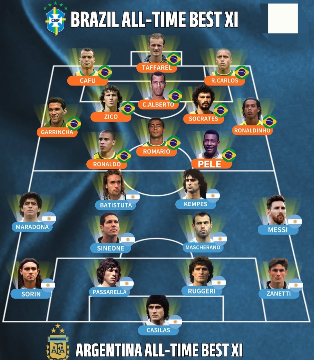 اینجا ترکیب منتخب تاریخ فوتبال برزیل و آرژانتین مقایسه شده است. هر دو تیم از افسانههای تاریخ فوتبال تشکیل شدهاند، اما ساختار و سبک انتخاب بازیکنان کمی متفاوت است: