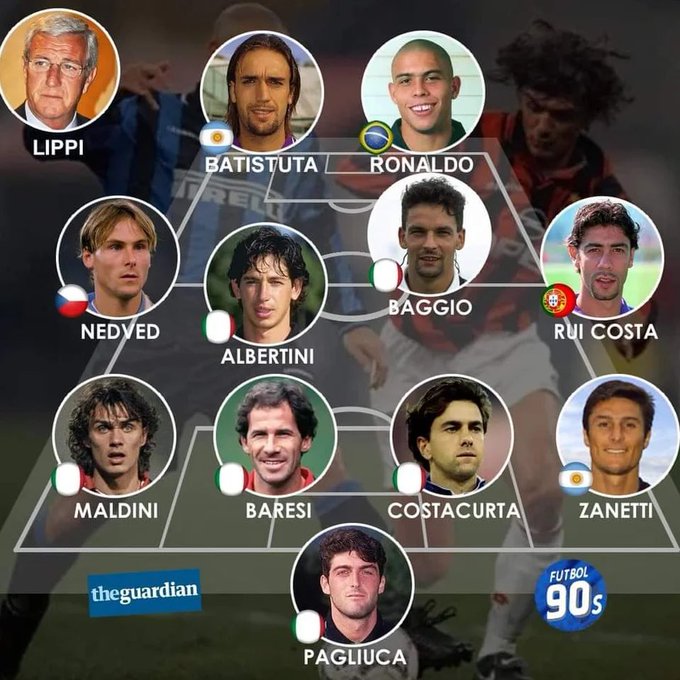 - روبرتو باجیو (میلان/ایتالیا، هافبک هجومی - AM): "الهه موهای فرفری" با پنالتیهای هنری و ۲۰۵ گل در سری آ – توپ طلا ۱۹۹۳، فینالیست جام جهانی ۱۹۹۴؛ خلاقیتش، الهامبخش ژاوی شد.