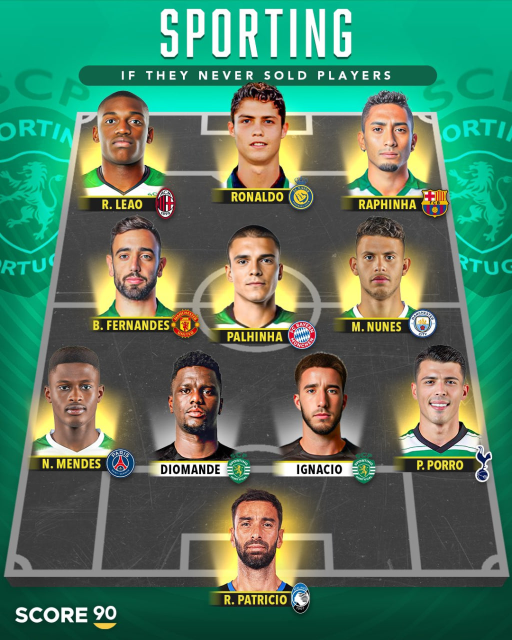 این تصویر یک ترکیب رویایی از تیم اسپورتینگ لیسبون (Sporting CP) را نشان میدهد با این فرض که اگر این باشگاه پرتغالی هرگز بازیکنانش را نمیفروخت، چه تیم قدرتمندی میتوانست داشته باشد.