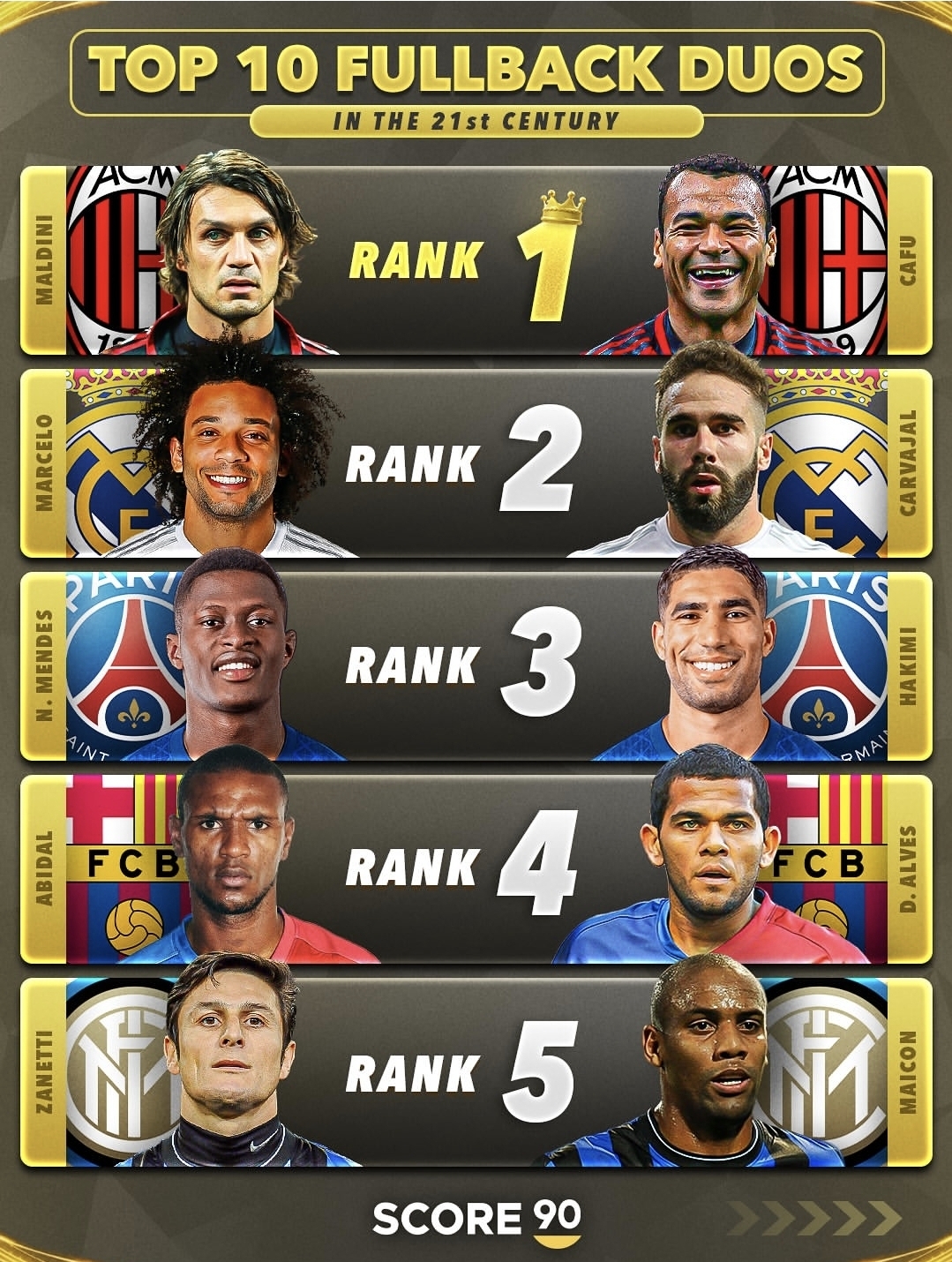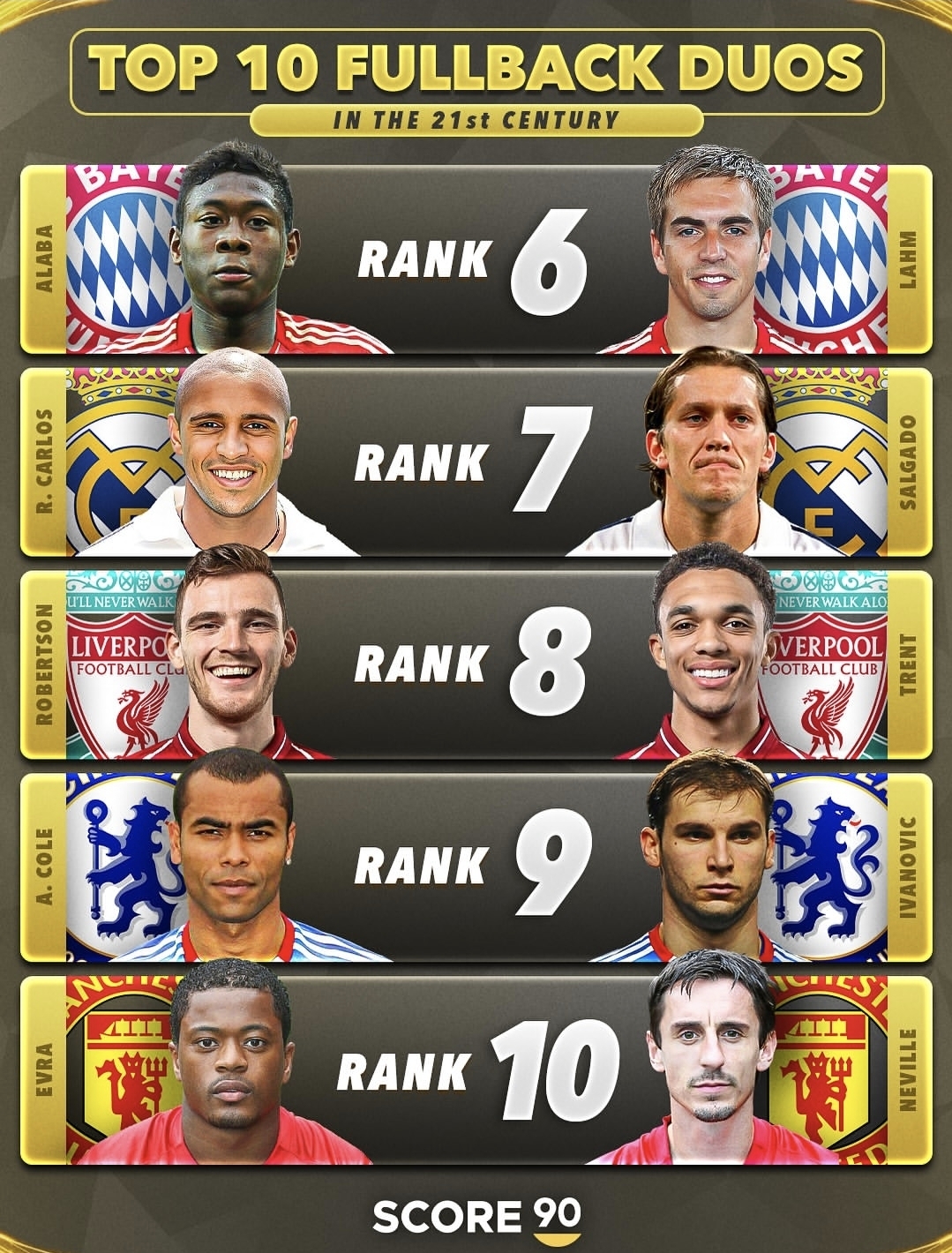 در این دو تصویر، شاهد معرفی ۱۰ زوج برتر مدافع کناری فوتبال در قرن ۲۱ هستیم. همواره مدافعان کناری یا همان فولبکها نقش بسیار مهمی در فوتبال مدرن داشتهاند؛ چرا که علاوه بر وظایف دفاعی، در حملات تیمی نیز مشارکت زیادی دارند. در این لیست، از بازیکنان بزرگی نام برده شده که در تیمهای باشگاهی مطرح اروپا سالها درخشیدند و جامهای متعددی را بالای سر بردند.