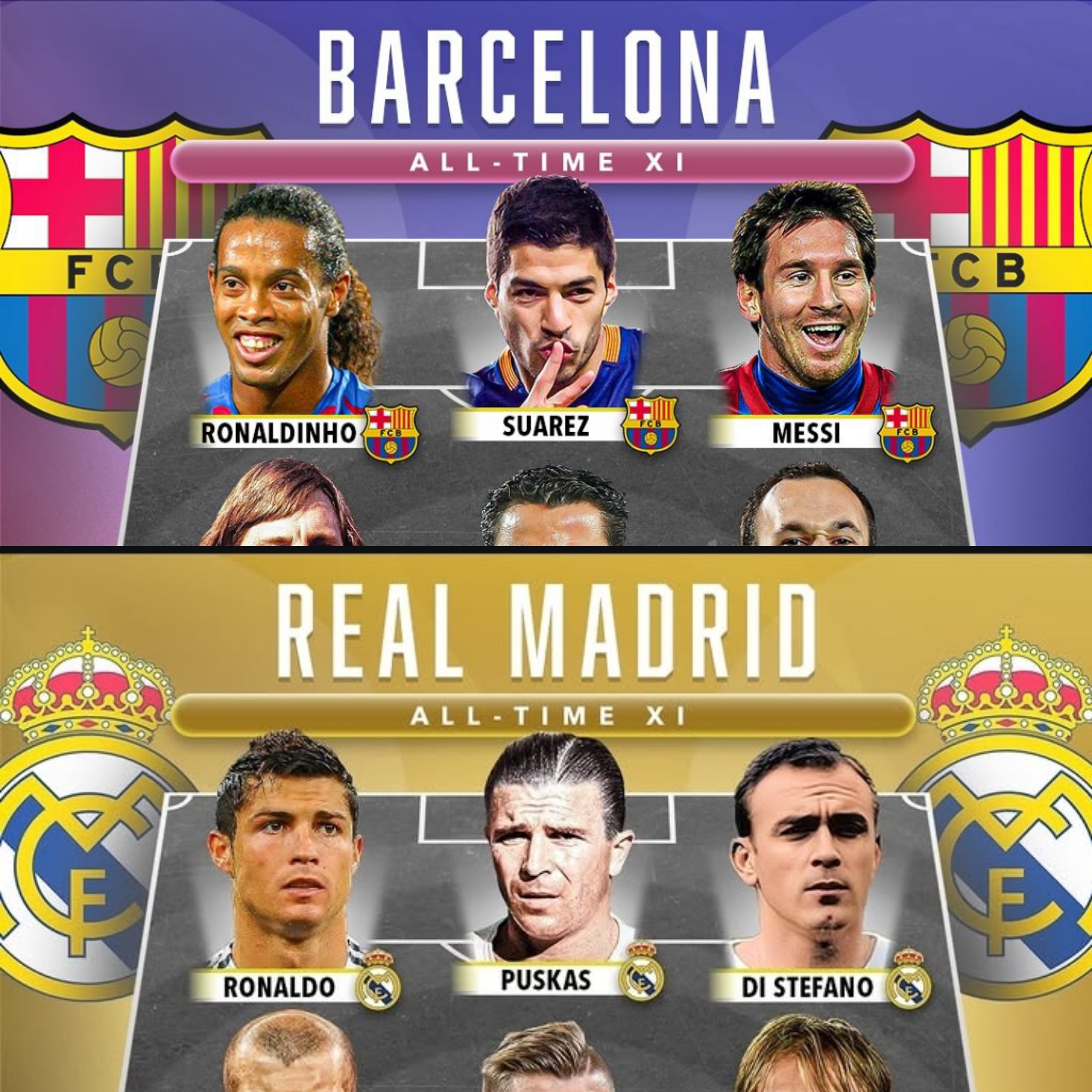 ترکیب بارسلونا و رئال مادرید در این تصویر، هر دو از بهترین بازیکنان تاریخ فوتبال تشکیل شدن، ولی مقایسهشون از نظر تاکتیکی و فردی میتونه اینطوری تحلیل بشه: