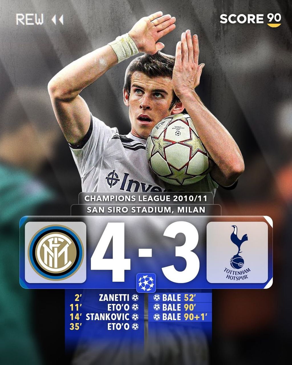 بیل در سنسیرو با سه گل در دقایق 52، 90 و 90+1 درخشید، اما تاتنهام با نتیجه 4-3 شکست خورد. اینتر با شروع طوفانی و گلهای زانتی، اتوئو و استانکوویچ، برتری رو حفظ کرد. بیل با سرعت و قدرتش همه رو تحت تأثیر قرار داد.