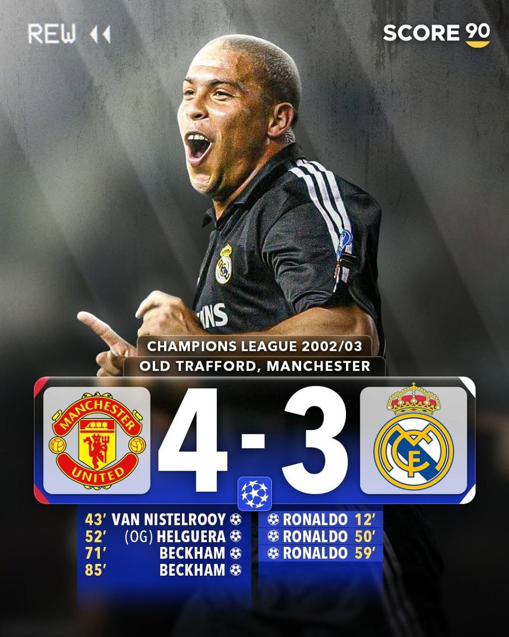 رونالدو با هتتریک در دقایق 12، 50 و 59 در اولدترافورد غوغا کرد. با وجود شکست 4-3 مقابل یونایتد، رئال به لطف برد در بازی رفت صعود کرد. تماشاگران انگلیسی حتی برای رونالدو ایستاده تشویق کردن—نمونهای از احترام به نبوغ.