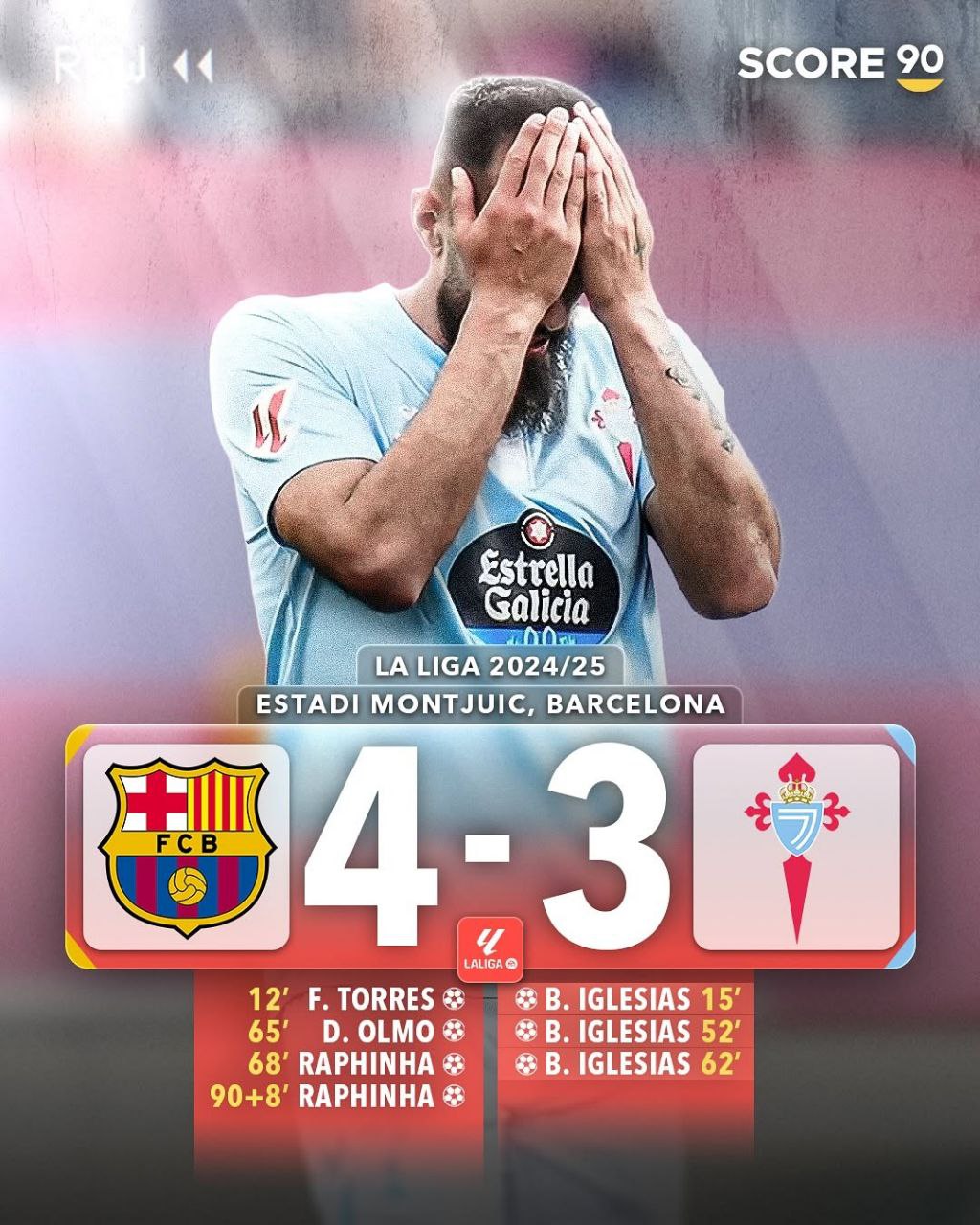 ایگلسیاس با هتتریک در دقایق 15، 22 و 62 بارها خط دفاع بارسا رو به چالش کشید، اما بارسلونا با گلهای تورس، اولمو و دو گل رافینیا، در وقتهای تلفشده 4-3 پیروز شد. بازی در مونتژوئیک برگزار شد و یکی از کامبکهای هیجانانگیز فصل بود.