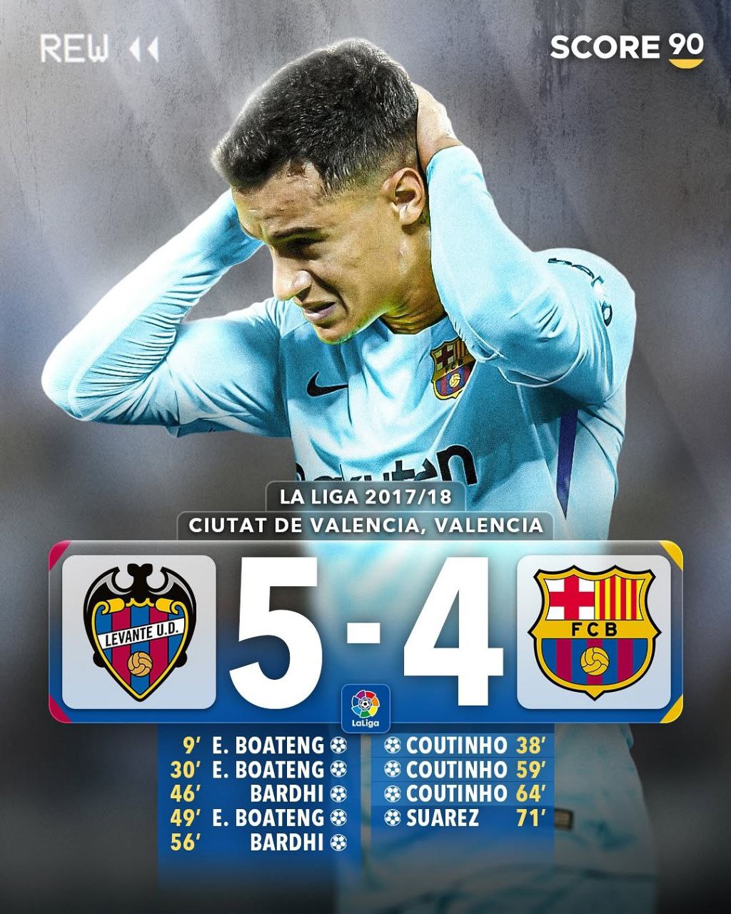 کوتینیو در این بازی با سه گل در دقایق 38، 59 و 64 درخشید، اما بارسلونا با نتیجه 5-4 شکست خورد. بازی در ورزشگاه سیوداد دِ والنسیا برگزار شد و با هتتریک امانوئل بوآتنگ و دو گل بردهی، لوانته شگفتیساز شد. کوتینیو با وجود تلاشش، نتونست مانع اولین شکست بارسا در اون فصل بشه.