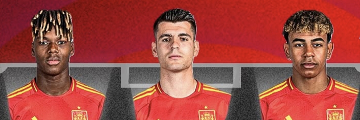 خط حمله اسپانیا نیز پر از استعدادهای بزرگ است. لامین یامال ستاره جوان بارسلونا که تنها در سنین نوجوانی به تیم ملی رسیده، امید آینده اسپانیا محسوب میشود. در کنارهها بازیکنانی مانند یِرمی پینو، نیکو ویلیامز، فران تورس و خسوس رینوندو حضور دارند که سرعت و تکنیک بالایی دارند. در نوک خط حمله، میکل اویارزابال و آلوارو موراتا به عنوان مهاجمان اصلی انتخاب شدهاند. موراتا با تجربه فراوان خود و اویارزابال با تکنیک و دقت بالا میتوانند خط حمله اسپانیا را خطرناکتر کنند.