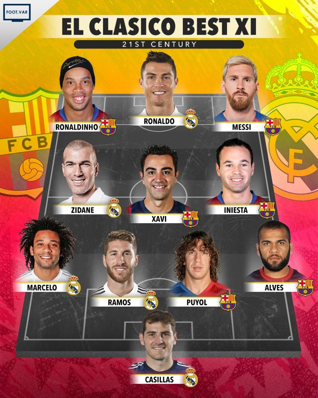 تصویر بالا ترکیب رؤیایی «الکلاسیکو» در قرن ۲۱ را نشان میدهد؛ ترکیبی از بهترین بازیکنان بارسلونا و رئال مادرید که در دو دهه اخیر تاریخساز شدهاند. الکلاسیکو، نام دیدارهای سنتی و فوقالعاده حساس دو تیم بزرگ فوتبال اسپانیا و جهان یعنی بارسلونا و رئال مادرید است. این رقابت نهتنها یک مسابقه فوتبال بلکه یک جنگ تمامعیار فرهنگی، سیاسی و ورزشی است که میلیونها بیننده در سراسر جهان را به خود جذب میکند.