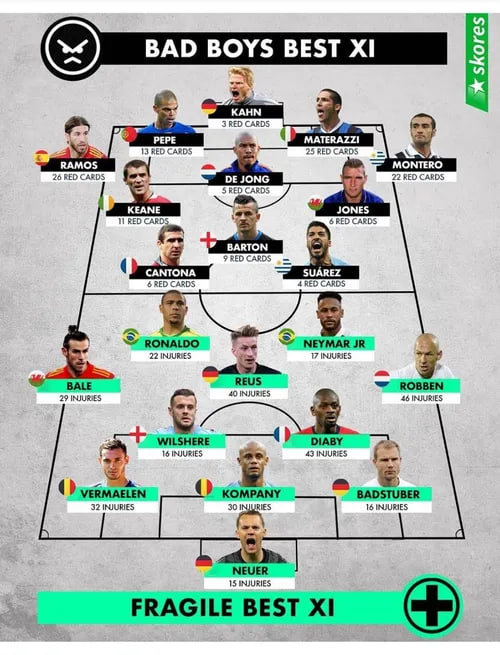 فوتبال همیشه صحنه حضور ستارههایی بوده که یا بهدلیل مصدومیتهای مداوم از اوج فاصله گرفتهاند، یا بهخاطر بازی خشن و برخوردهای پرحاشیهشان شناخته میشوند. ترکیب رویایی بازیکنان همیشه مصدوم در برابر تیمی از بازیکنان «مصدومکننده» میتواند جدالی خاص و پرماجرا باشد. نیمار و رونالدو نازاریو در یک سو، و راموس، پپه و روی کین در سوی دیگر؛ تقابلی جذاب بین نبوغ و خشونت