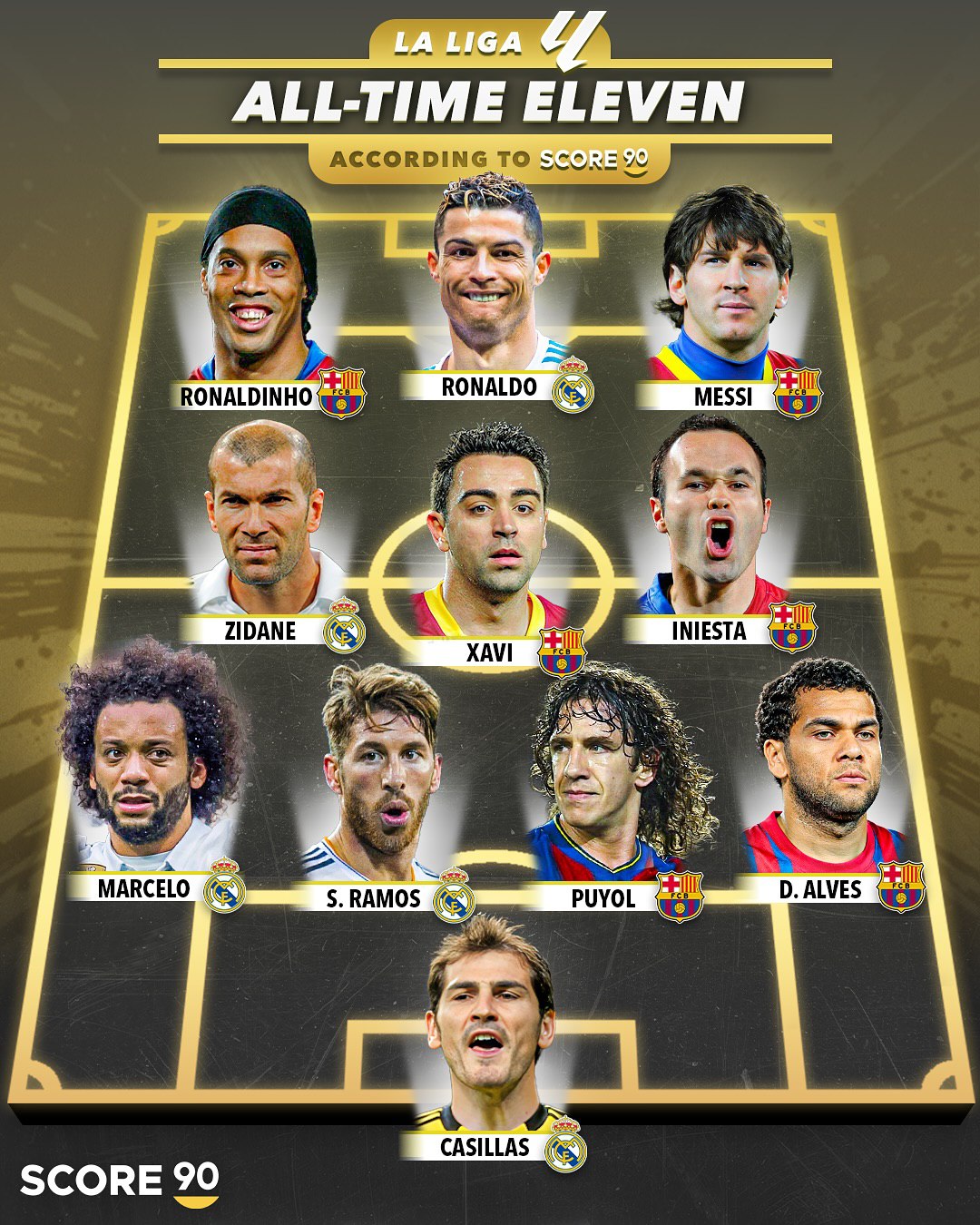 عالی — در این تصویر، دو ترکیب منتخب «تمام دوران» لیگهای لالیگا و لیگ برتر انگلیس (Premier League) از نگاه Score 90 نمایش داده شدهاند. بیایید بهصورت دقیق و تحلیلی این دو ترکیب را مقایسه کنیم:
