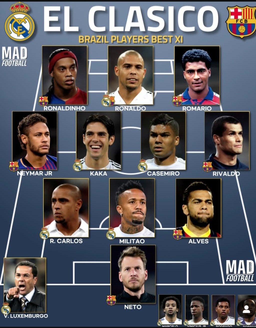 در این ترکیب بازیکنان فوتبال برزیلی حضور دارند که برای رئال مادرید یا بارسلونا، دو تا از معروف ترین باشگاه های فوتبال جهان بازی کرده اند. این گرافیک به صورت 3-4-3 مرتب شده است و بازیکنانی را در بر می گیرد که اثر قابل توجهی در هر دو باشگاه به جا گذاشته اند.