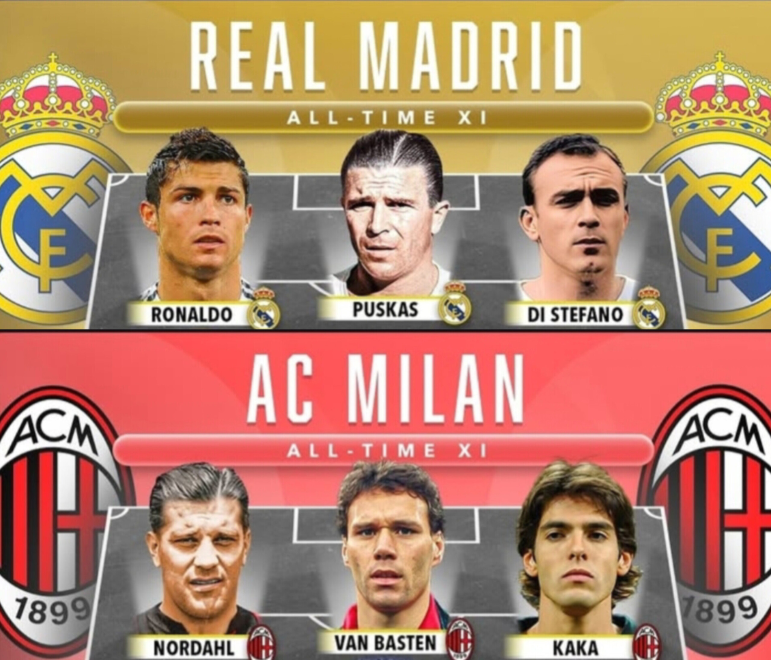 تقابل «ترکیب منتخب تاریخ آث میلان» و «ترکیب منتخب تاریخ رئال مادرید» یکی از جذابترین نبردهای فرضی تاریخ فوتبال است. بیایید مقایسه را گامبهگام بررسی کنیم.