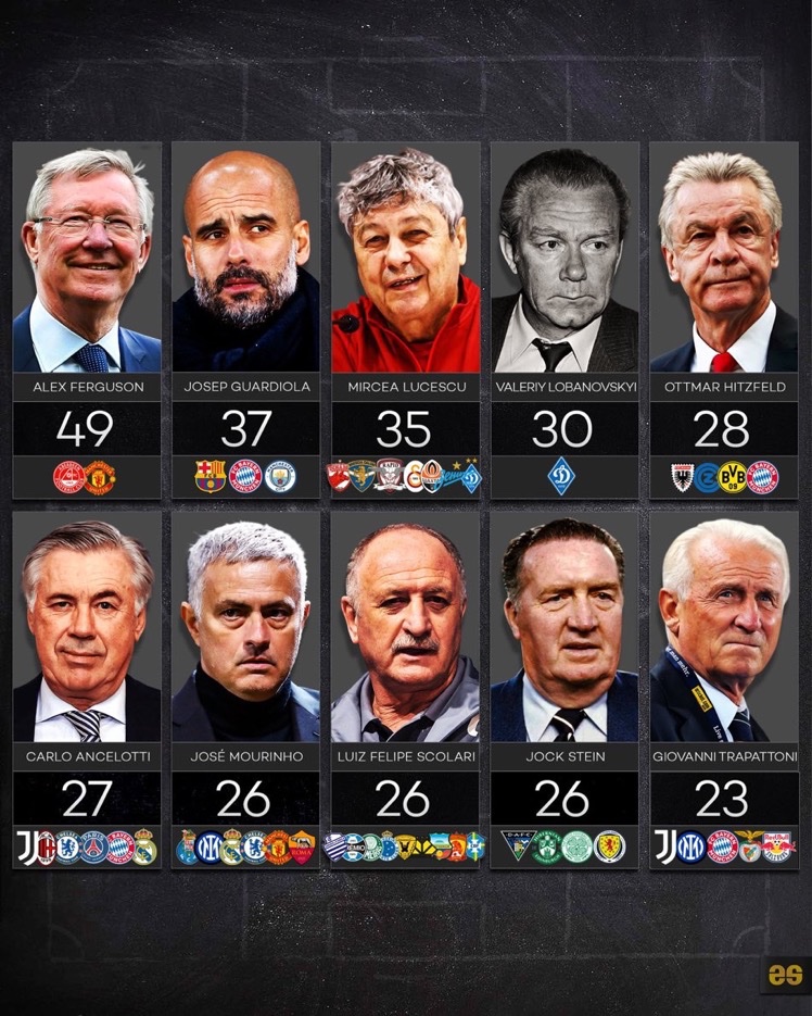 اوتمار هیتسفلد، مربی آلمانی با ۲۸ جام، یکی از معدود کسانی است که توانسته لیگ قهرمانان اروپا را با دو تیم مختلف (دورتموند و بایرن مونیخ) فتح کند. در ادامه، کارلو آنچلوتی با ۲۷ جام در رتبه ششم جای دارد. آنچلوتی یکی از معدود مربیانی است که با چهار قهرمانی لیگ قهرمانان اروپا، رکورددار این تورنمنت به شمار میرود و با تیمهایی چون میلان، رئال مادرید و بایرن درخشان بوده است.
