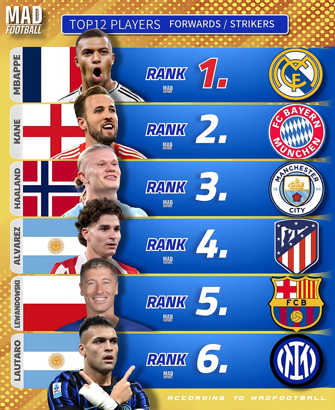 این دو تصویر مربوط به فهرست بهترین مهاجمان و فورواردهای حال حاضر فوتبال جهان هستند که توسط صفحه معروف فوتبالی MAD FOOTBALL منتشر شدهاند. در این لیست ۱۲ نفره، بازیکنان برتر از باشگاههای مطرح اروپایی و حتی تیمهای آسیایی انتخاب شدهاند. این رتبهبندی با هدف معرفی برترین گلزنان و مهاجمان قرن بیست و یکم صورت گرفته و ترکیبی از ستارگان ثابتشده و استعدادهای نوظهور فوتبال را در بر میگیرد.