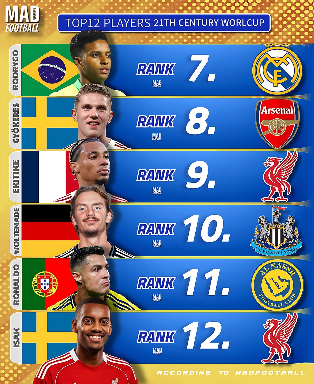 در رتبه دهم، ولتماده از نیوکاسل یونایتد حضور دارد که یکی از پدیدههای نوظهور فوتبال آلمان است. رتبه یازدهم به کریستیانو رونالدو، اسطوره پرتغالی و بازیکن النصر عربستان تعلق دارد؛ ستارهای که همچنان با وجود سن بالا، کیفیت خود را در زمین نشان میدهد. و در نهایت، الکساندر ایساک از لیورپول در رتبه دوازدهم قرار دارد که با بازی درخشان خود در لیگ جزیره به عنوان یکی از امیدهای آینده فوتبال اروپا شناخته میشود.