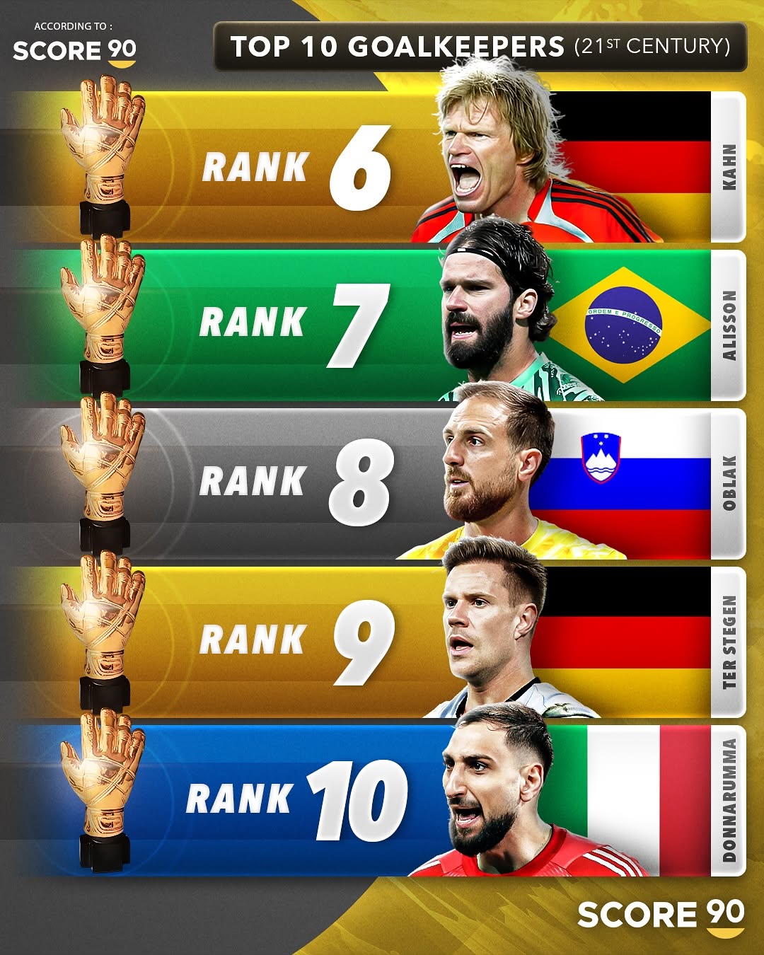 در نیمه دوم جدول، اولیور کان (Oliver Kahn) از آلمان در رتبه ششم قرار دارد؛ یکی از پرافتخارترین دروازهبانان تاریخ بایرن مونیخ که با قدرت بدنی و انگیزه مثالزدنیاش شناخته میشود. پس از او، آلیسون بکر (Alisson Becker) از برزیل در رتبه هفتم قرار دارد؛ گلری مدرن که با لیورپول و تیم ملی برزیل درخشیده است.
